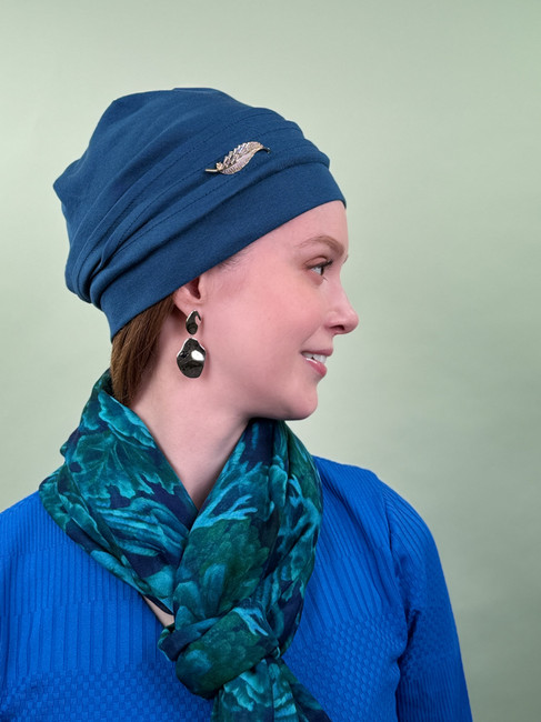 Rows of delicate pleats add soft volume to this 100% cotton hat. It looks lovely as a beanie, and also as a turban hat. I've styled it above with my (current) favorite scarf.