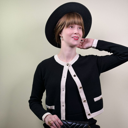 Black straw boater: Amazon / Cardigan: French Connection / Cloche: Betmar 23" inner circumference / Earrings: Etsy