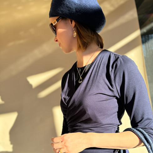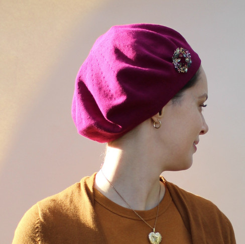 Cotton beret in both photos: Parkhurst, orchid purple / Brooch: Amazon / Locket necklace: similar here / Black sweater: Amazon Essentials, XS-6X / Skirt: Amazon, XS-3X