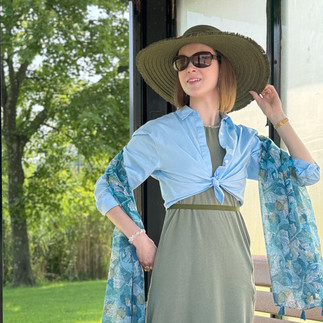 Straw hat: San Diego Hat Co, 22.25" with string to tighten / Jersey bolero: Amazon, S-XL / Chiffon dress: Amazon, S-XL / Necklace: Etsy