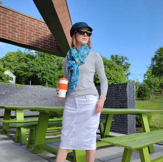 Hat: Amazon / Neck scarf: Amazon / Tee: Amazon Essentials, XS-6X / Denim skirt: Esteez, 0-18