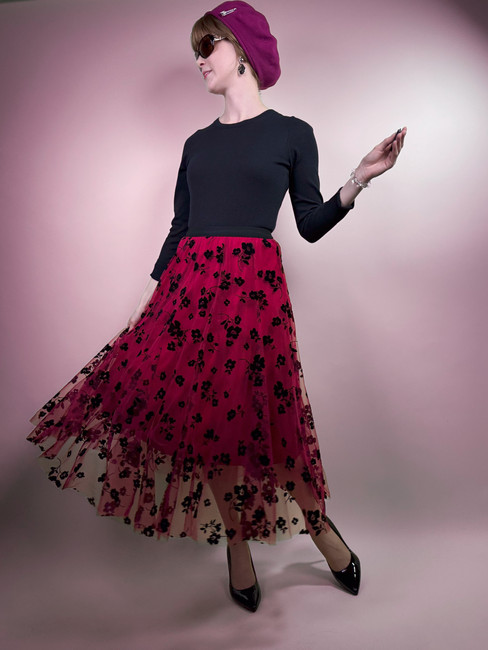 Beret: Parkhurst, orchid purple / Earrings: Pavoi / Sweater: Amazon Essentials, XS-6X / Skirt: Amazon, XS-3X